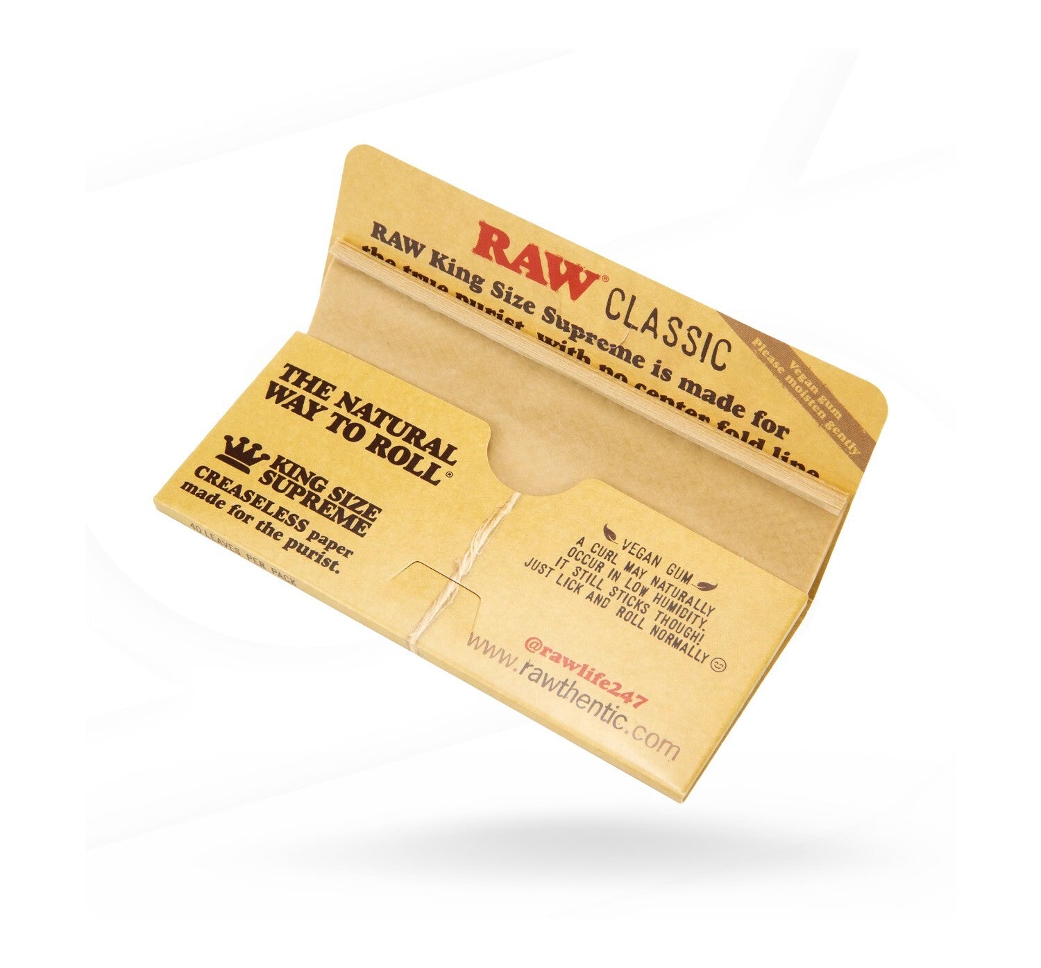 RAW Classic Creaseless Kingsize Supreme Papers are perfect for smokers who value tradition and quality. The unrefined, all-natural materials are meticulously crafted in Spain to meet RAWs high standards of excellence, offering a clean and authentic smoking experience. Whether youre a seasoned smoker or new to rolling, these papers provide the perfect combination of quality, sustainability, and performance, making every session a celebration of pure smoking pleasure.