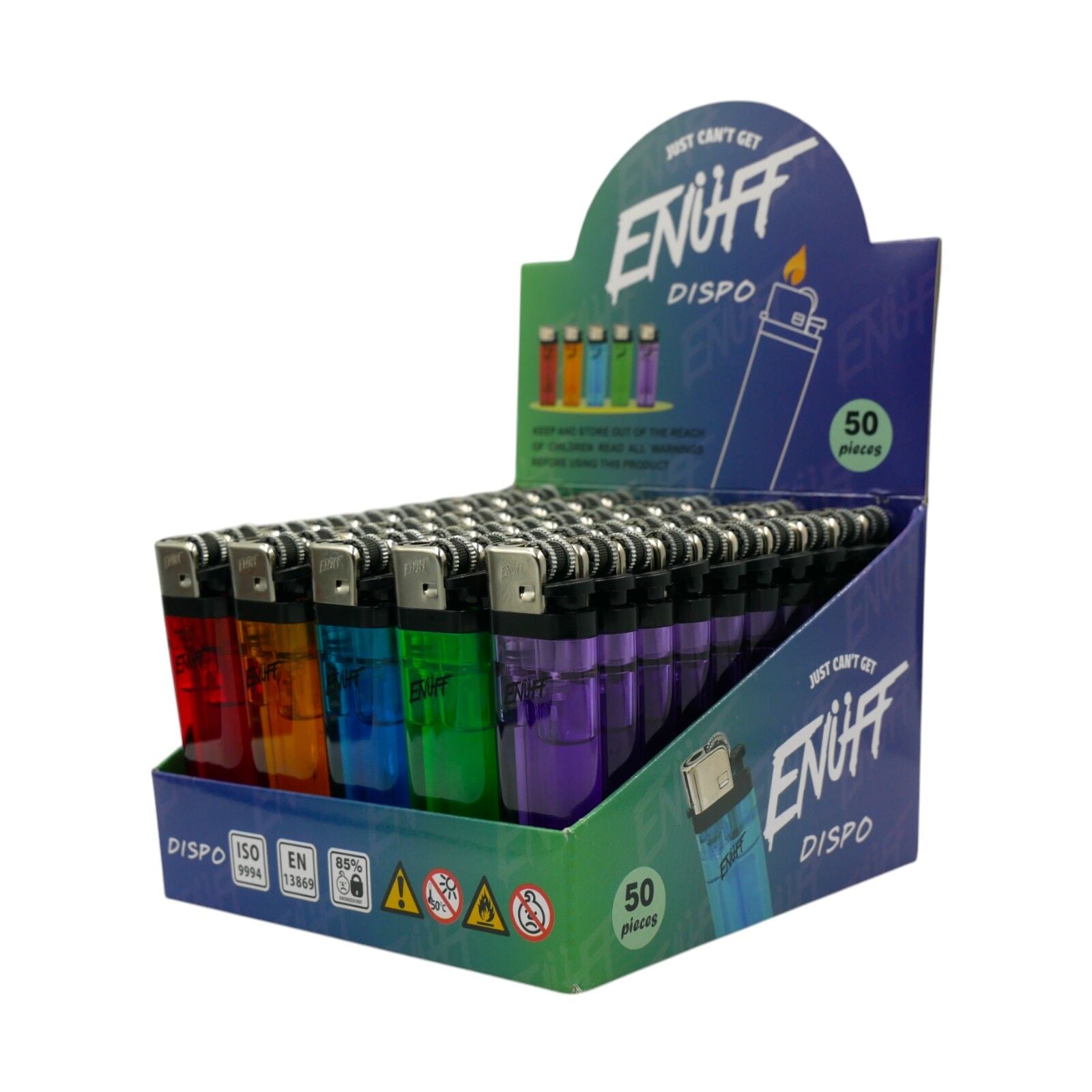 50 Enuff Lighters Gas Adjustable Flame Assorted Colours Tray