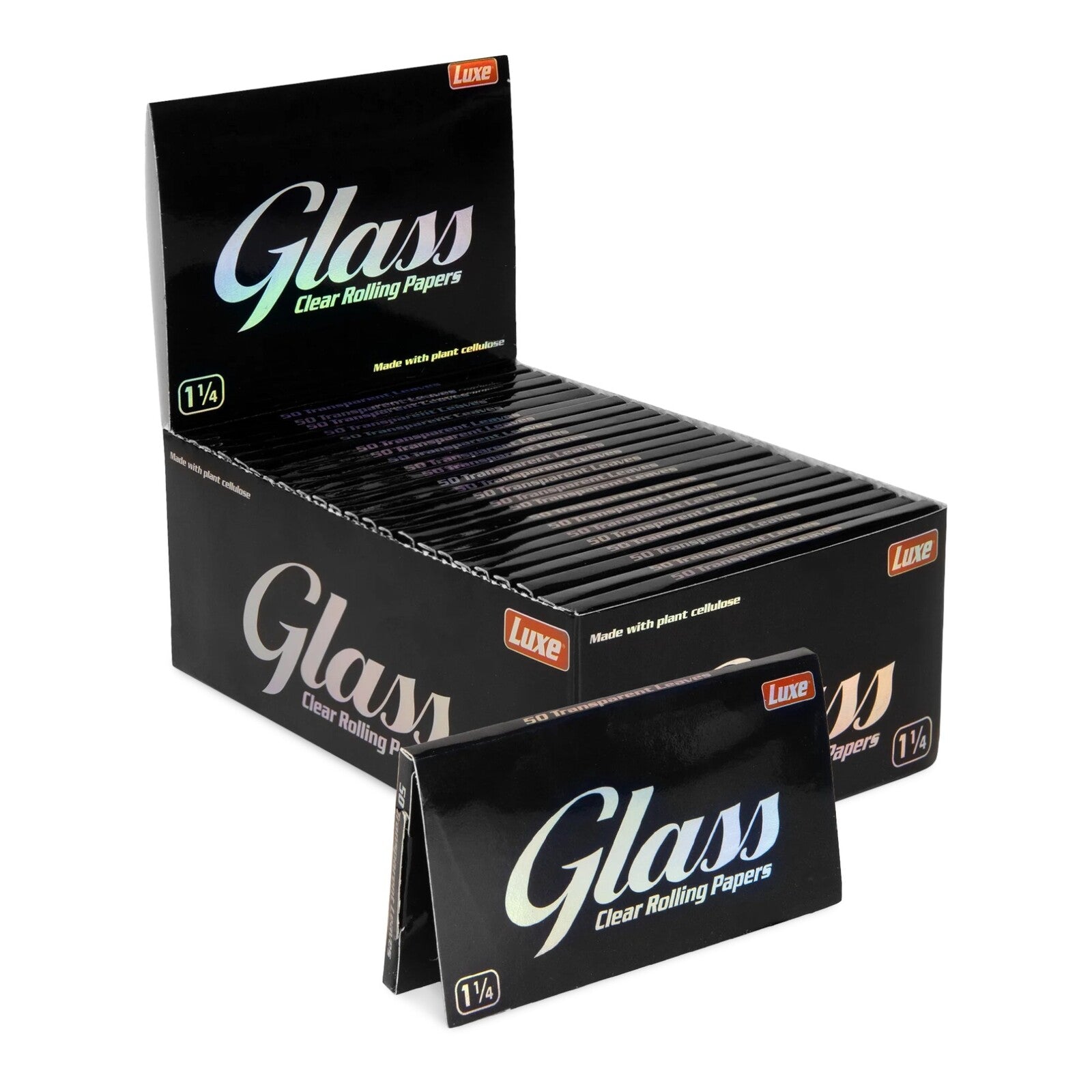 Experience a unique smoking ritual with the Box of 24 Glass Clear Rolling Papers 1 1/4 Size Slim. Each box contains 24 booklets, with each booklet holding 50 natural, unbleached rolling papers for a transparent and natural smoking experience.