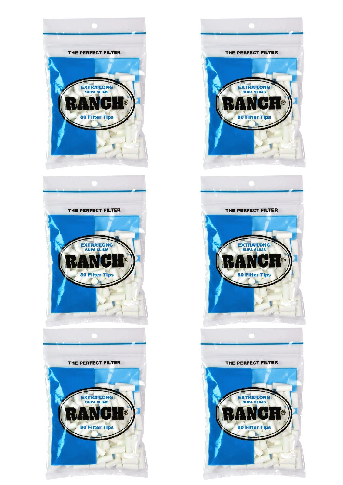 Ranch Extra Long Supa Slim Cigarette Filters, 6 Bags of 80 Filter Tips - Total 480